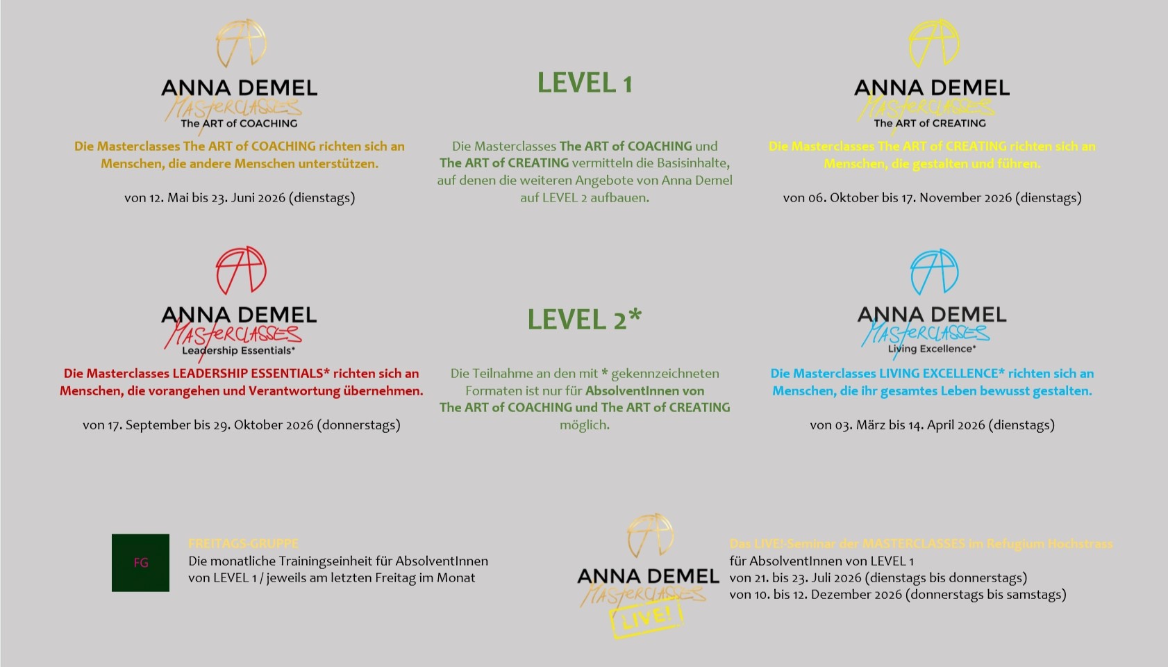 Die MASTERCLASSES mit Anna Demel sind als Training auf fortgeschrittenem Niveau konzipiert. „Fortgeschritten“ bedeutet in dem Kontext sowohl die Vorbildung in den Bereichen Selbstreflexion und Kommunikation als auch das hohe Interesse der Teilnehmenden an stetiger persönlicher Weiterentwicklung.
