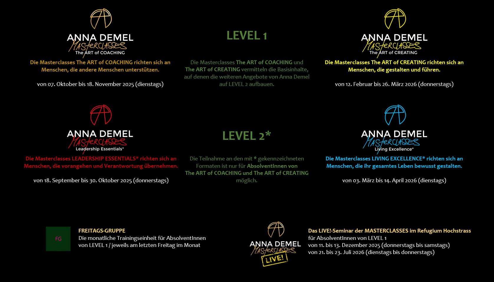 Die MASTERCLASSES mit Anna Demel sind als Training auf fortgeschrittenem Niveau konzipiert. „Fortgeschritten“ bedeutet in dem Kontext sowohl die Vorbildung in den Bereichen Selbstreflexion und Kommunikation als auch das hohe Interesse der Teilnehmenden an stetiger persönlicher Weiterentwicklung.